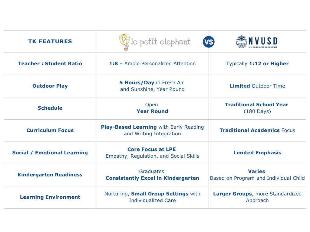 Selecting the right TK program for your child is an important aspect of their academic journey. The chart below explains the key differences between our program, and NVUSD’s Transitional Kindergarten programs.